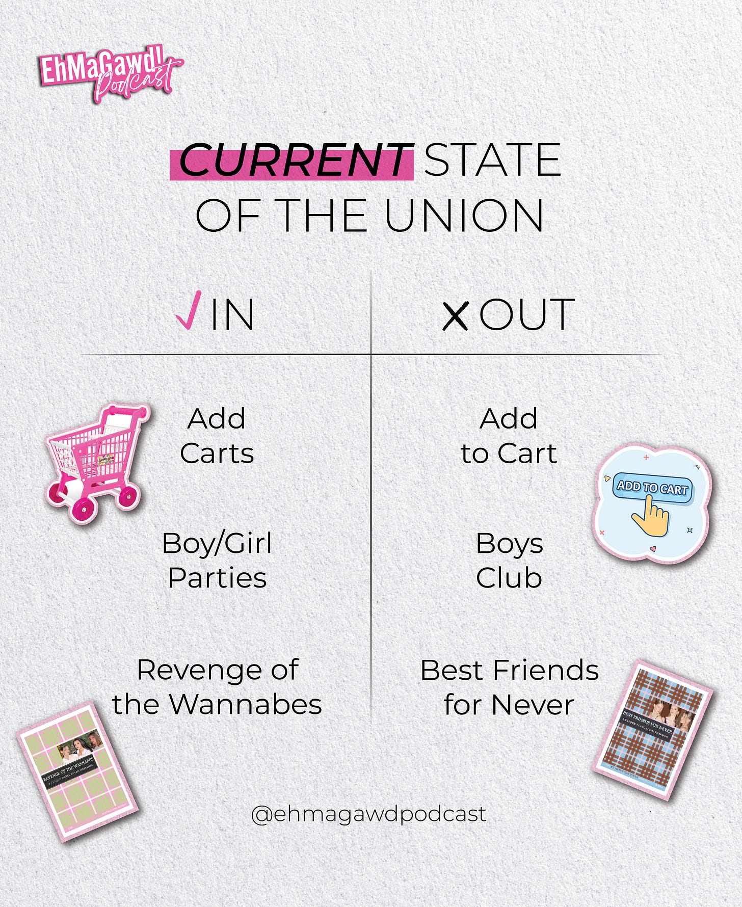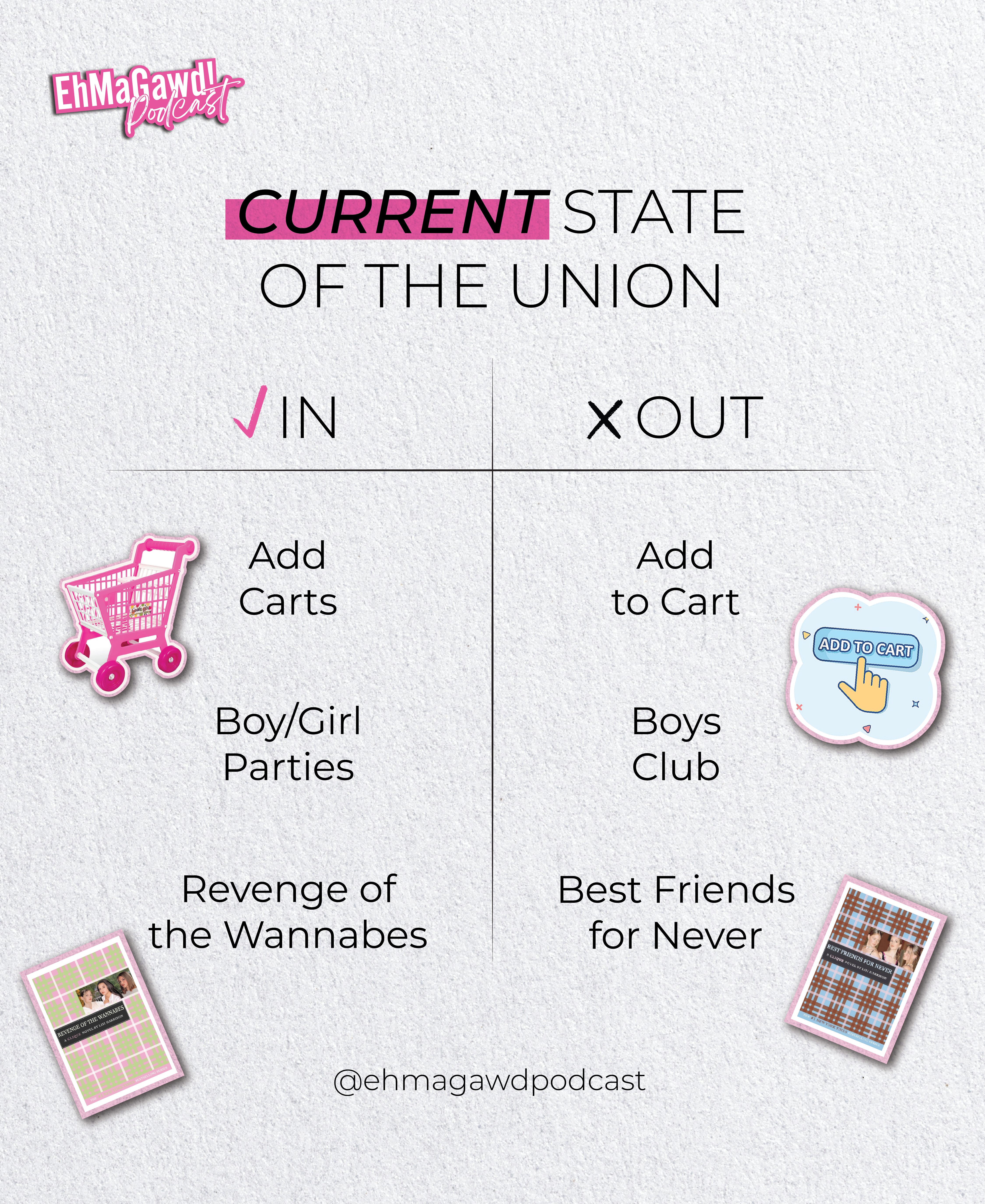 In this episode of EhMaGawd, Ellen and Lisi discuss Best Friends For Never, the second book in the Clique series. Did Lisi really have to buy a copy just to reread it? Is Ellen dressed to match the cover? Those answers rhyme with “mess.”