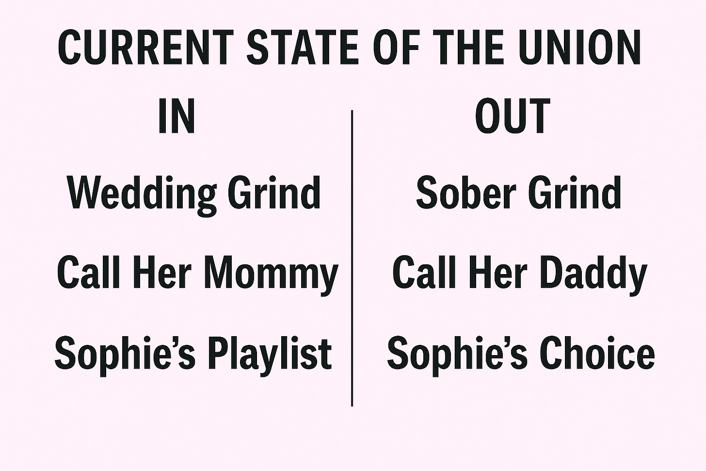 Digressions include: sober grinding at high school dances, wedding pressure, Lindsey Lohan, Jamba Juice, and trippy realizations.